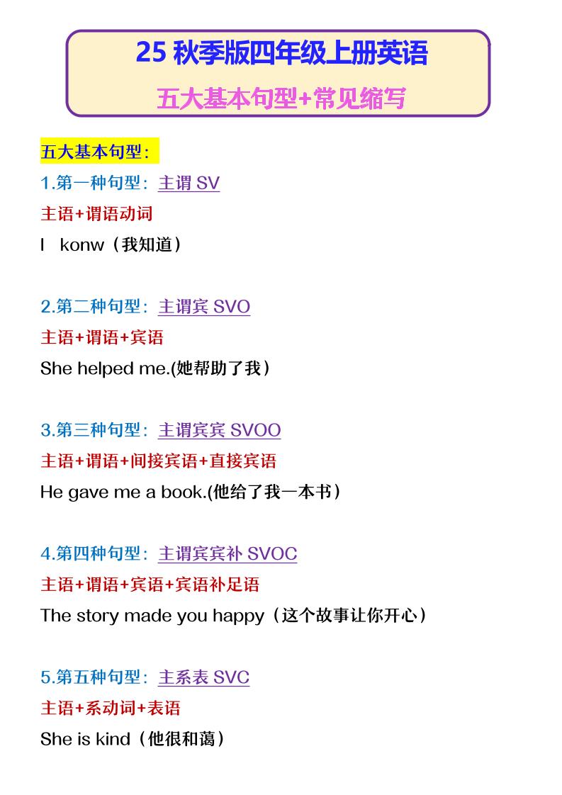 繁星职途 四年级 【2025秋新版】四年级上册英语五大基本句型+常见缩写 https://www.fanxingzhitu.com/11566.html