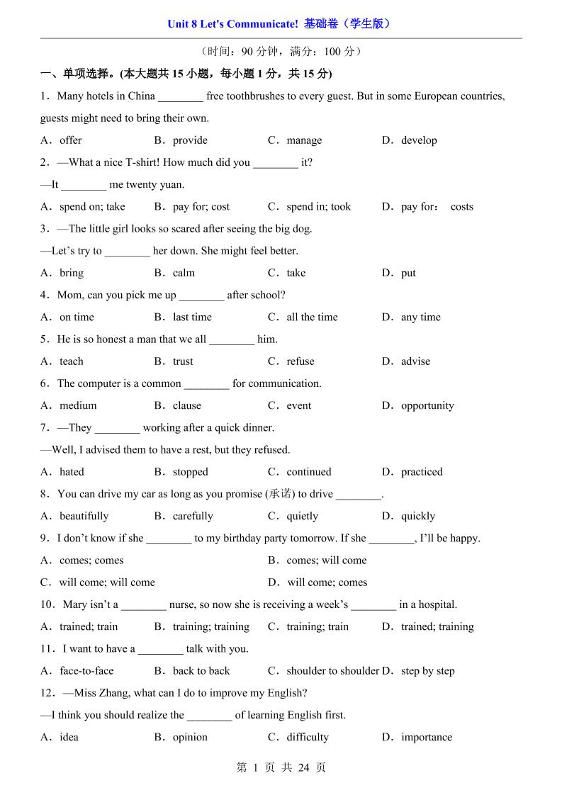 - 八年级上英语Unit8基础卷(冀教版) 2025-11-29