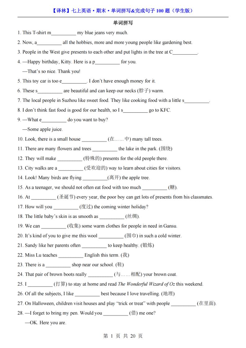 繁星职途 七年级 七年级上英语期末单词拼写完成句子100题(译林版) https://www.fanxingzhitu.com/31771.html