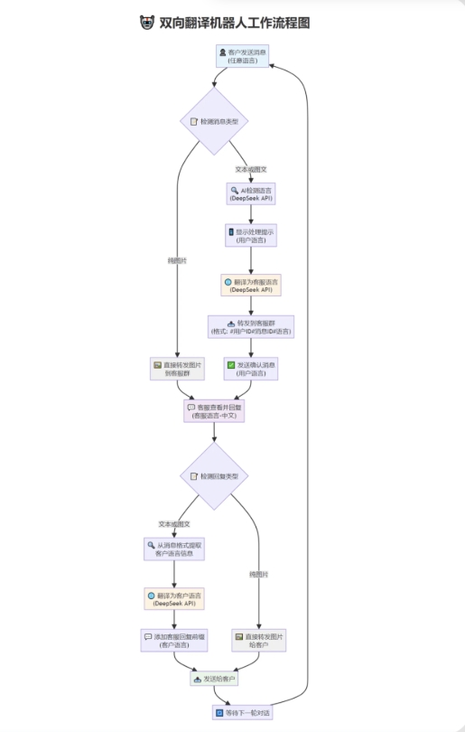 tgAI全自动翻译智能人工客服 客服机器人源码 带视频搭建教程 互联网转载 具体未测试 功能说明: 1.双向功能,这个不用说 2.将客户消息翻译为客服配置的指定语言,不管客户消息是哪个国家的语言,只要是deepseek能识别的语言都可以。 3.将客户发送的消息翻译为符合客户国家口语习惯的语言