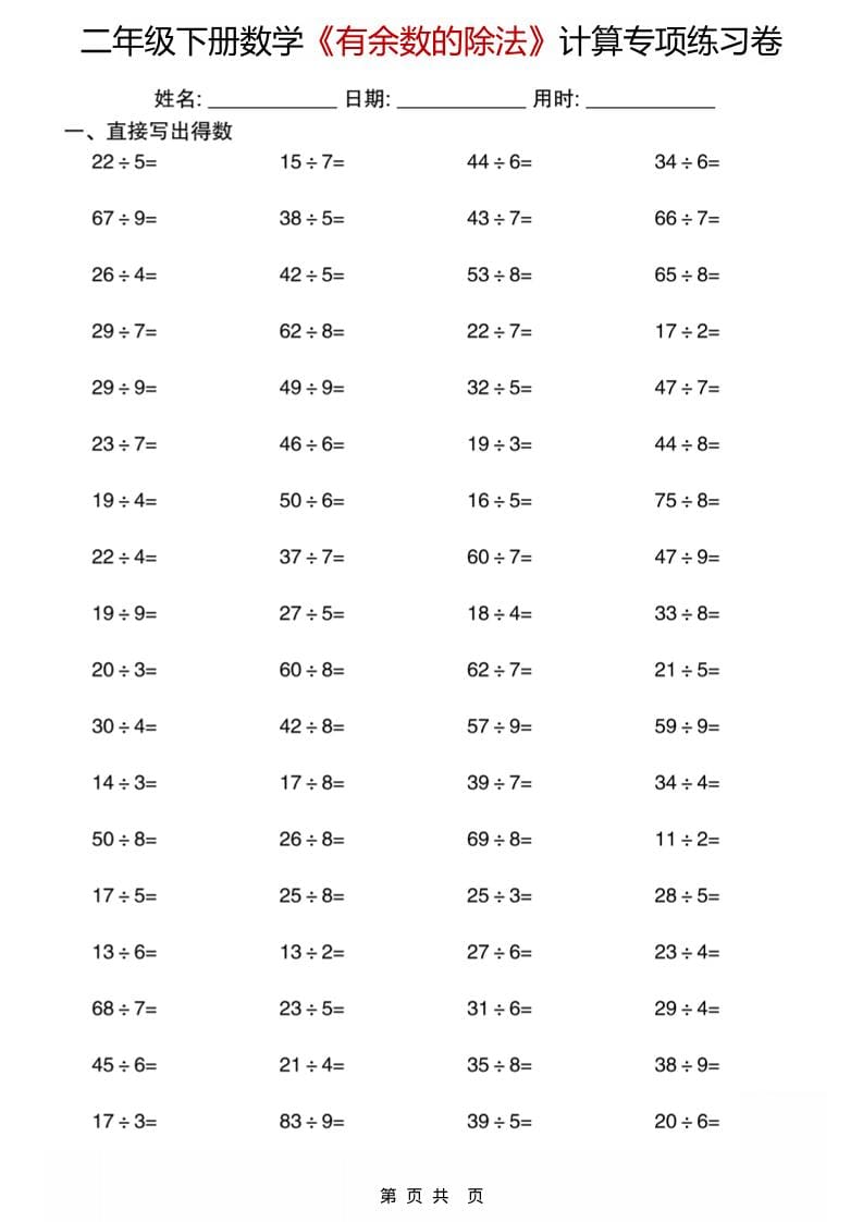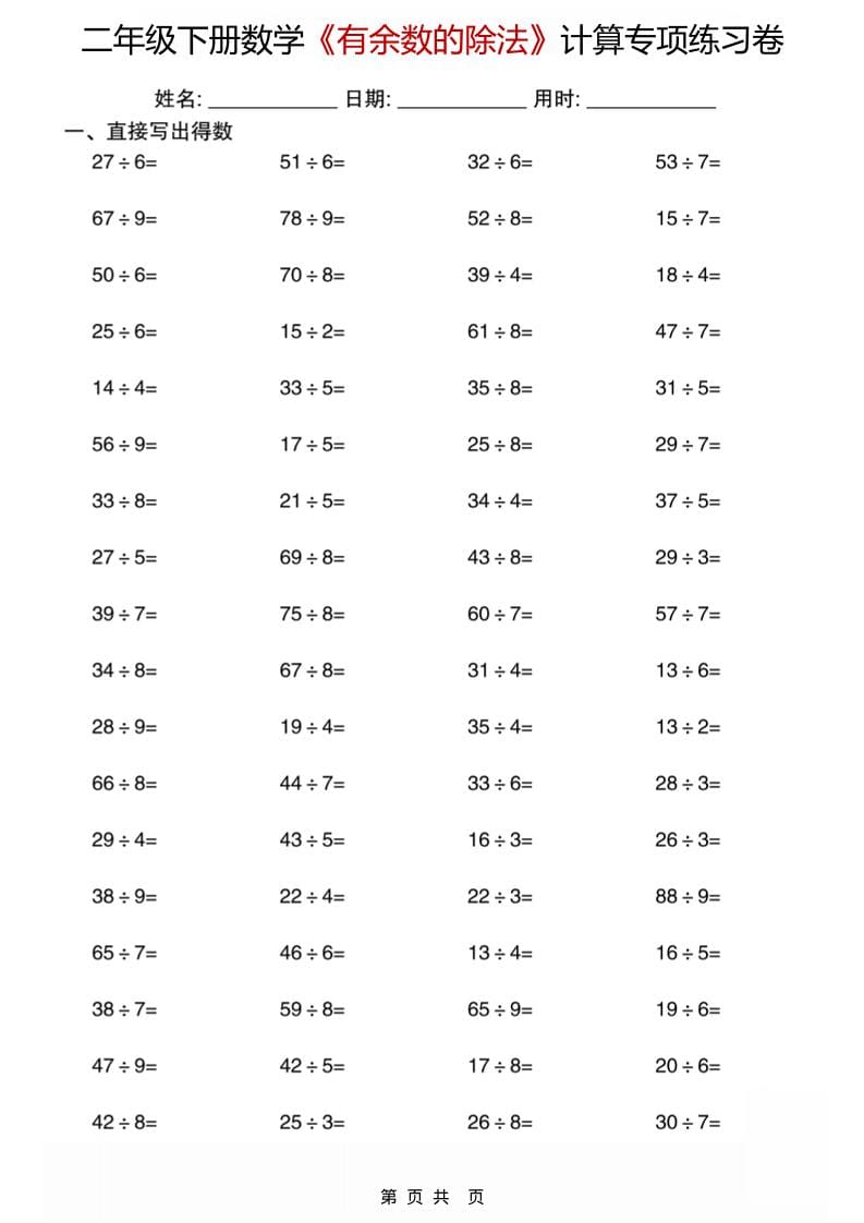 繁星职途 二年级 二年级下数学《有余数的除法》计算专项练习卷 https://www.fanxingzhitu.com/45850.html