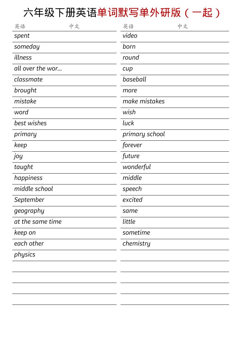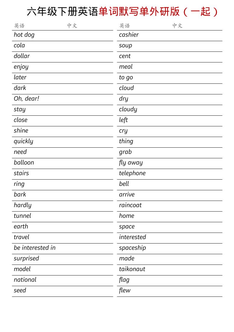 繁星职途 六年级 六年级下英语全册单词默写单《外研版(一起)》 https://www.fanxingzhitu.com/53591.html