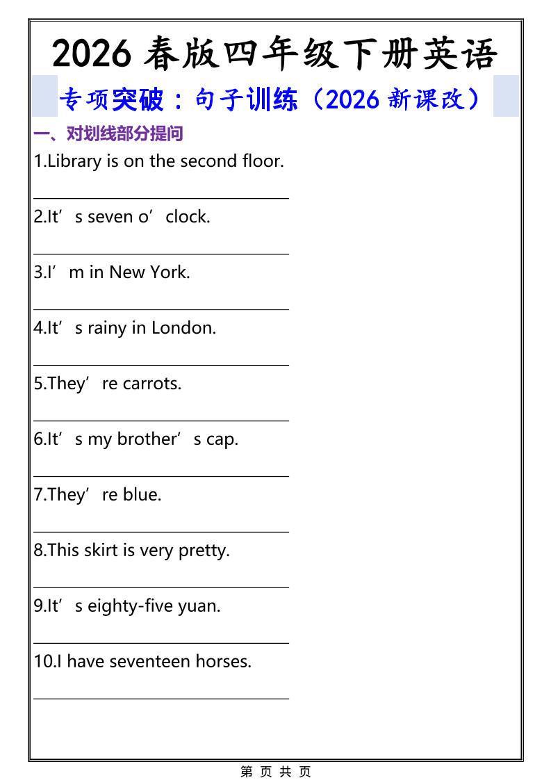 繁星职途 四年级 2026春新版四年级下英语句子专项训练《人教版PEP》 https://www.fanxingzhitu.com/60781.html